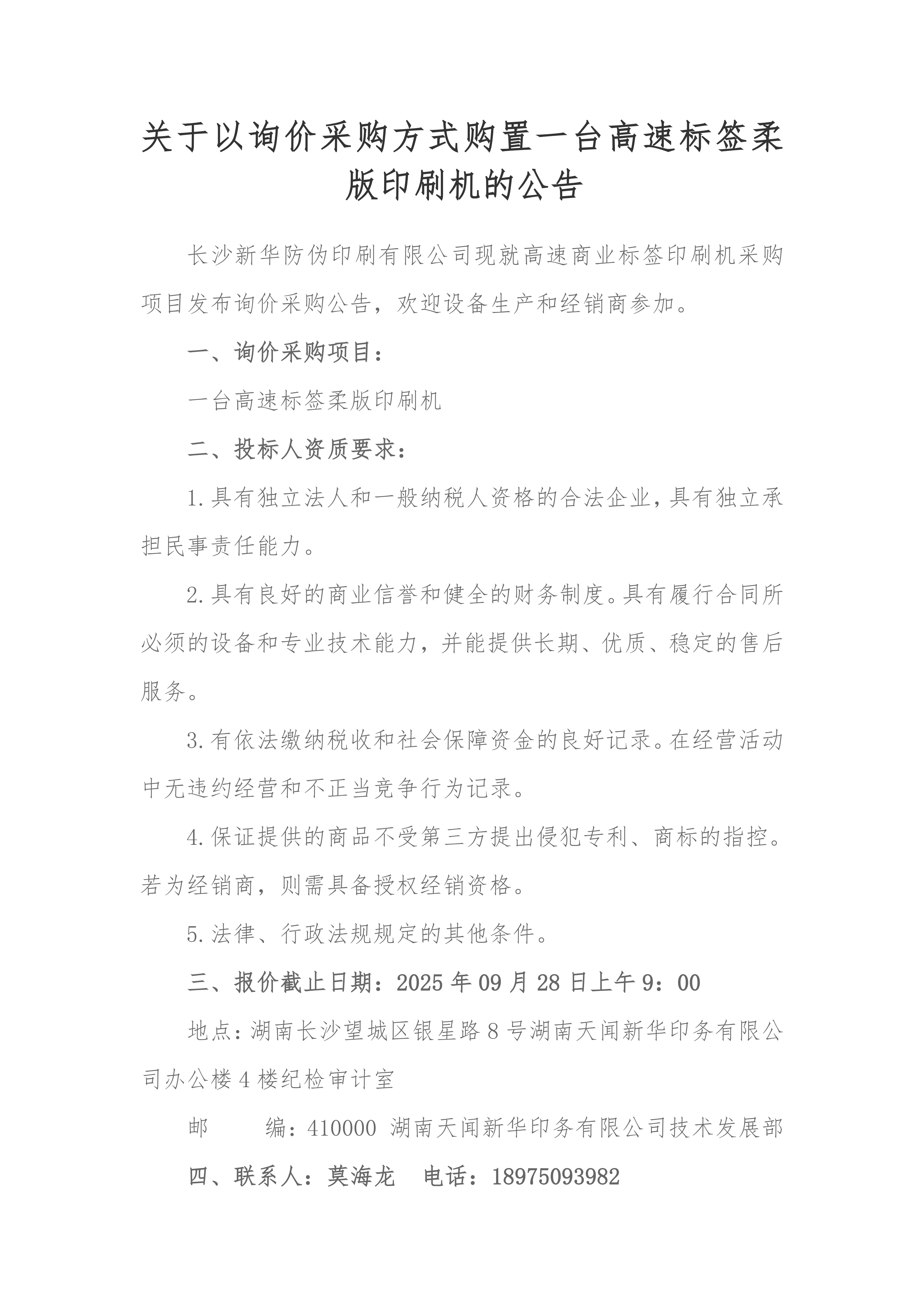 关于以询价采购方式购置一台高速标签柔版印刷机的公告