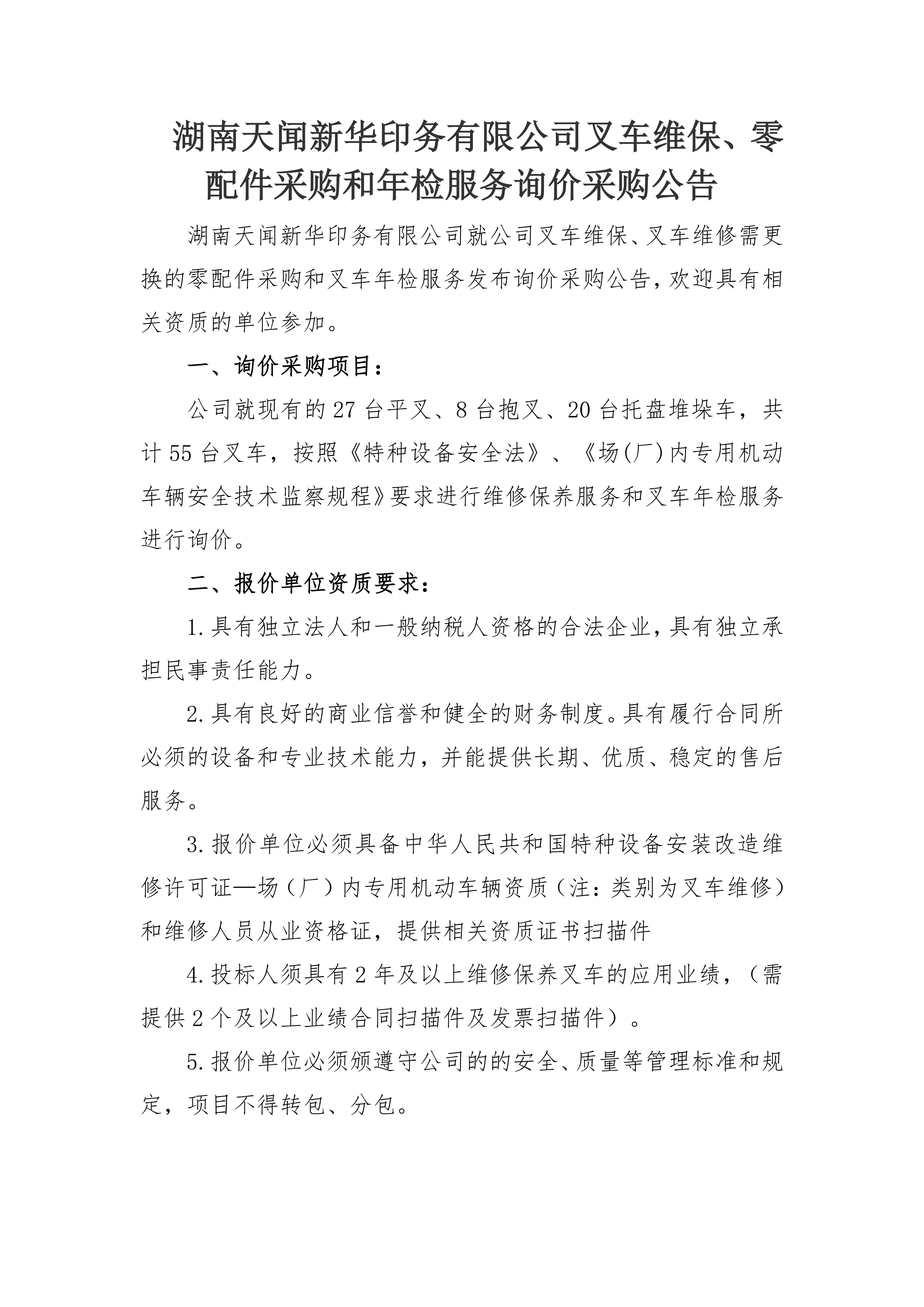 湖南天闻新华印务有限公司叉车维保、零配件采购和年检服务询价采购公告