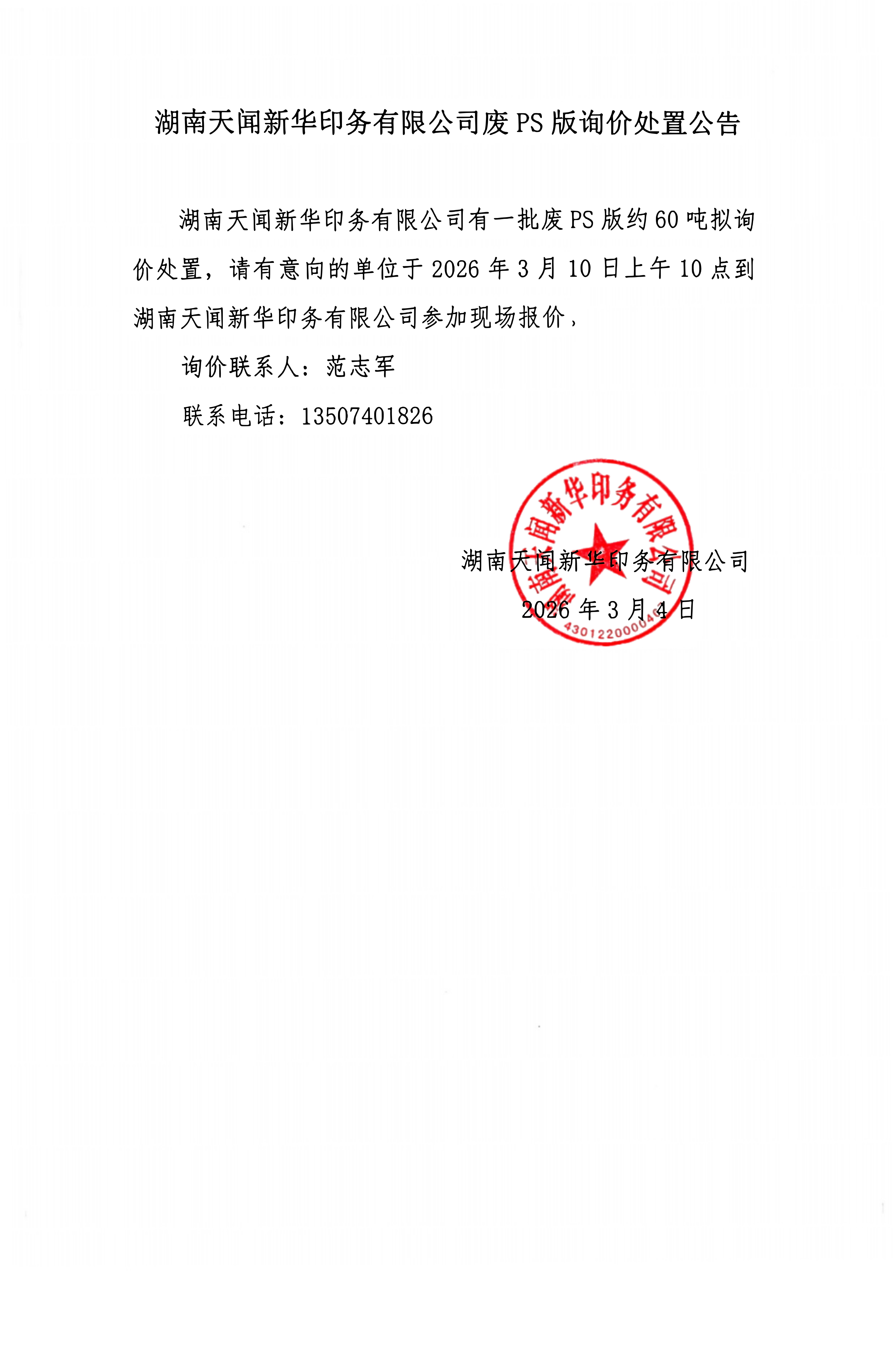 湖南天闻新华印务有限公司废PS版询价处置公告